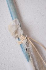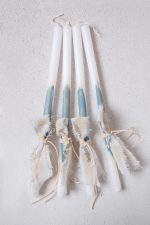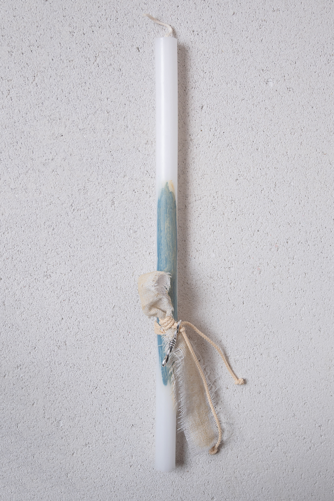 Κερί διακοσμημένο με ρετάλια εμποτισμένα σε ακρυλικό οικολογικό χρώμα και τεχνοτροπία στο φόντο. Διακοσμούν το κερί μεταλλικά στοιχεία.