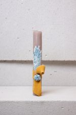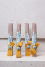 Αρωματικό κερί διακοσμημένο με ρετάλια εμποτισμένα σε ακρυλικό οικολογικό χρώμα και τεχνοτροπία στο φόντο. Διακοσμούν το κερί κεραμικά λουλούδια